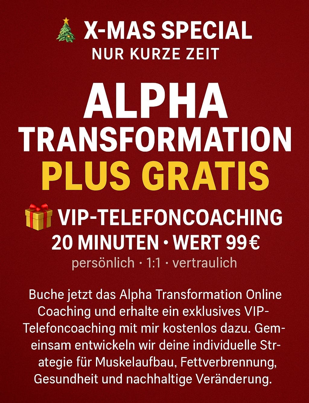 Das Programm Alpha Transformation ist ein digitales Selbstlernangebot zur persönlichen Weiterbildung in den Bereichen Fitness, Ernährung und Motivation. Es enthält vorproduzierte Inhalte ohne persönliche Betreuung, Bewertung oder Prüfung. Es handelt sich ausdrücklich nicht um Fernunterricht im Sinne des Fernunterrichtsschutzgesetzes (FernUSG).
